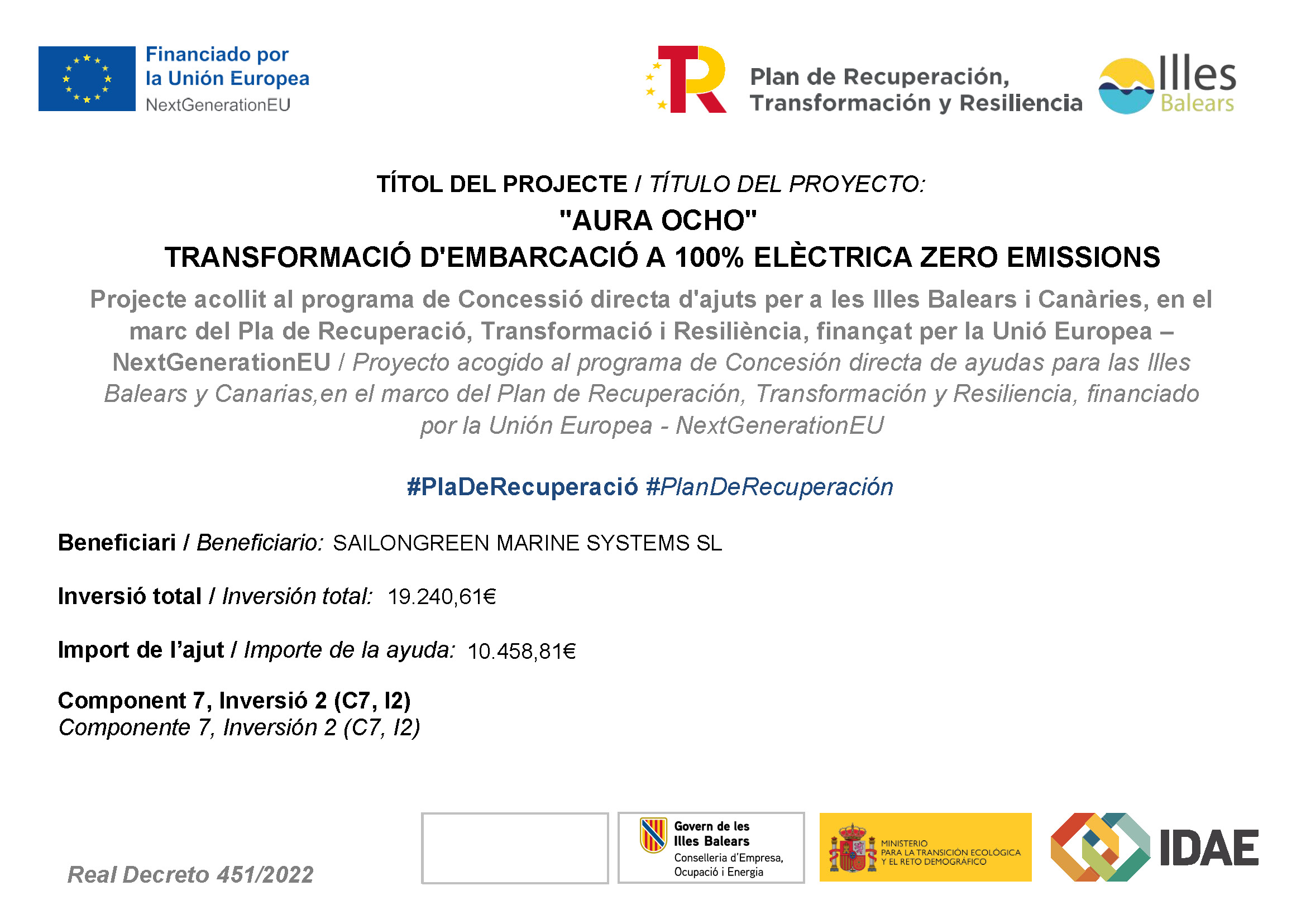 Aura ocho, embarcación 100% eléctrica y cero emisiones con el objetivo de realizar excursiones marítimas sin afectar al medio en el que se desarrolla su actividad, proyecto financiado por el programa “AYUDAS DESTINADAS A LA DESCARBONIZACIÓN DEL SECTOR NÁUTICO DE LAS ILLES BALEARS” procedentes de fondo europeos NextGenerationEU.